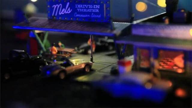 This commission was created for a Model Railroad builder who wanted a vintage Drive-in. To come up with this look I combined with what I’ve seen in films, such as Grease and research online, I started my design. I decided to name my theater Mel’s Drive-in, from American Graffiti. The Drive-in features a drive-up concession stand, gravel ground, classic cars, a ticket booth and projection booth. The crown jewel of it all is the working projection screen.